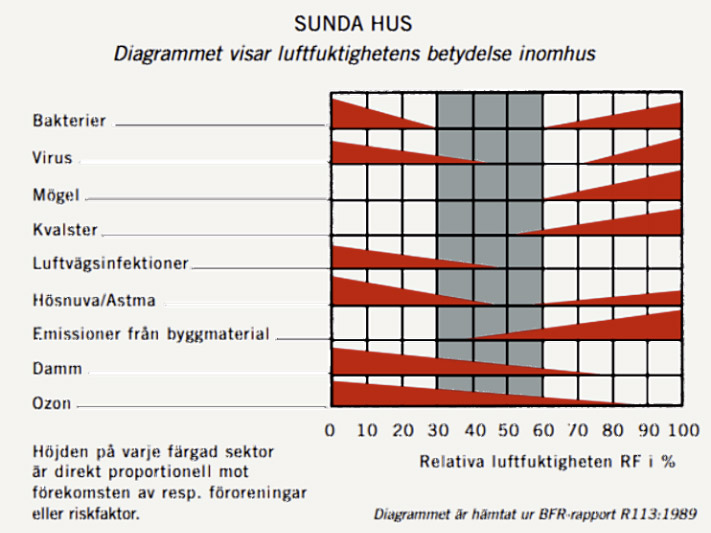 Vi människor mår som bäst när den relativa luftfuktigheten ligger mellan 40 och 60 procent. Det är det spann där våra slemhinnor, luftvägar, ögon och hud fungerar som bäst - och där bakterier, virus och dammpartiklar trivs sämst. När luftfuktigheten faller under 30 % torkar slemhinnorna ut, vilket ökar risken för infektioner, hosta och irritation i ögon och hals. Personer med astma, allergi eller hudproblem som eksem märker ofta störst skillnad - de mår betydligt bättre när luftfuktigheten är högre och mer stabil. Se bild nedan där det markerade området visar när vi mår bra och vad som trivs när det är torrare eller fuktigare.