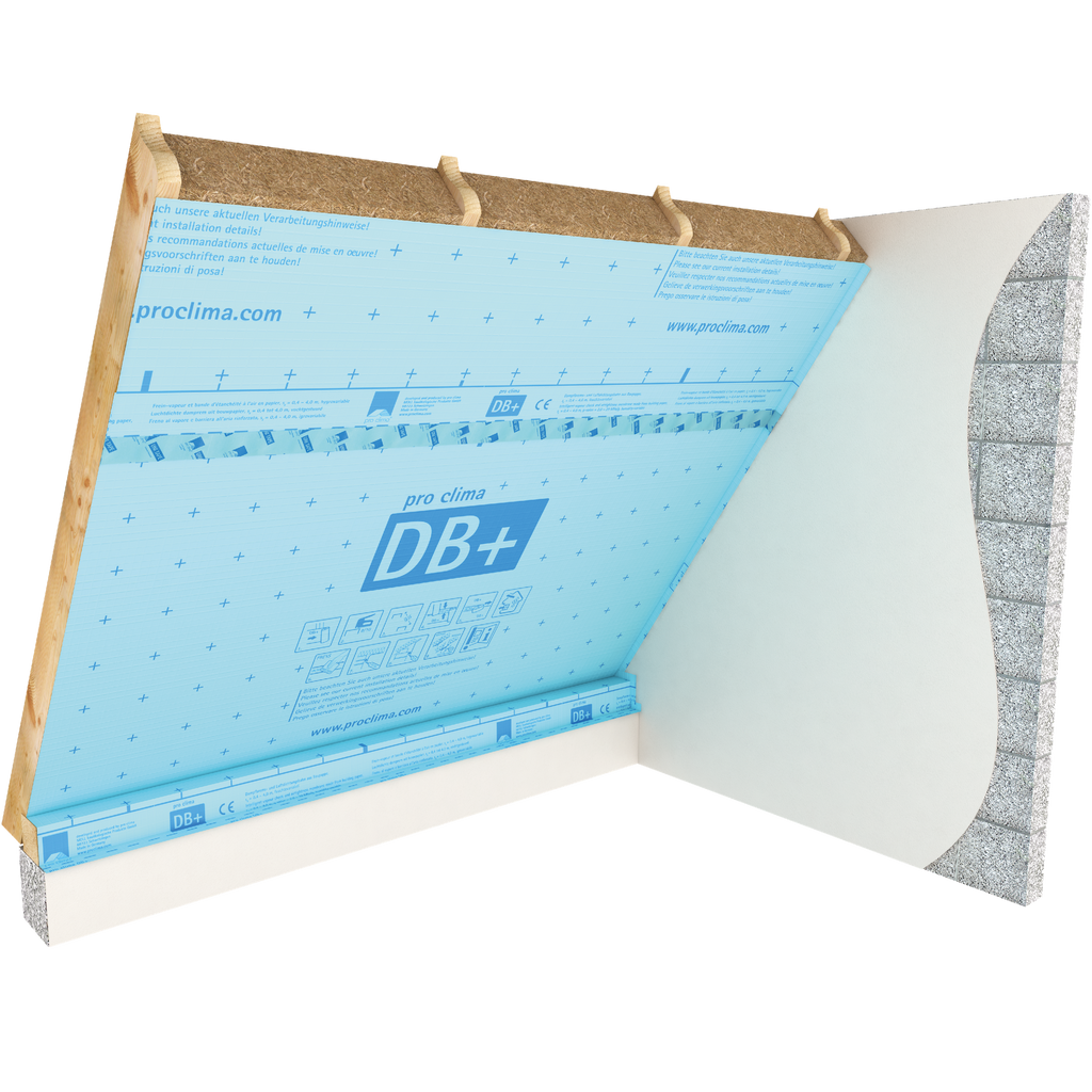 Pro Clima Hydrosafe® ångbroms DB+. Längd 50 m Bredd: 2,75 m. Extra brett membran för användning på tak, väggar och golv i kombination med all fiberisolering, inklusive inblåst isolering, på strukturer som är öppna eller stängda för diffusion på utsidan, efter lämpliga designberäkningar.