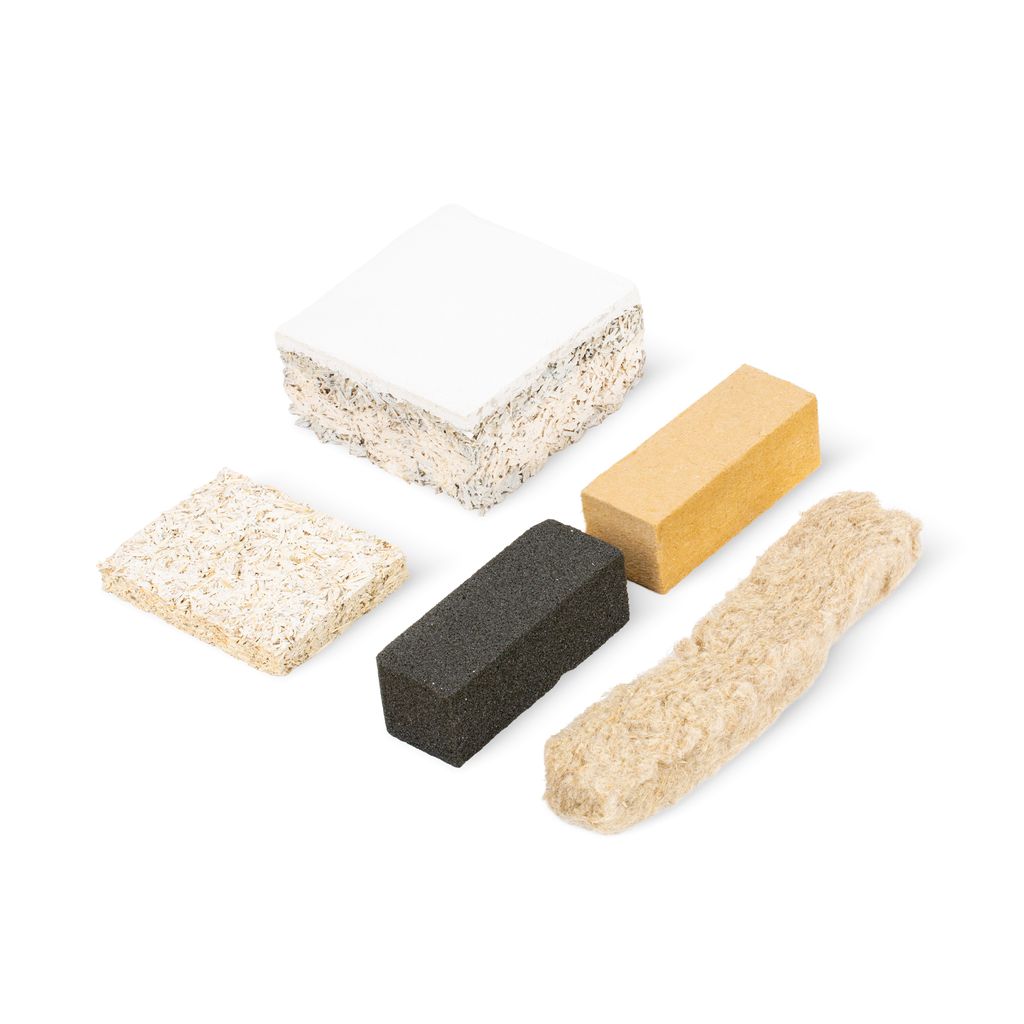 En provbox med naturliga och hållbara isoleringsmaterial för väggar, tak och grund. Innehåller träfiber, hampafiber, hampakalk och foamglas – alla med unika egenskaper för energieffektivt och sunt byggande.