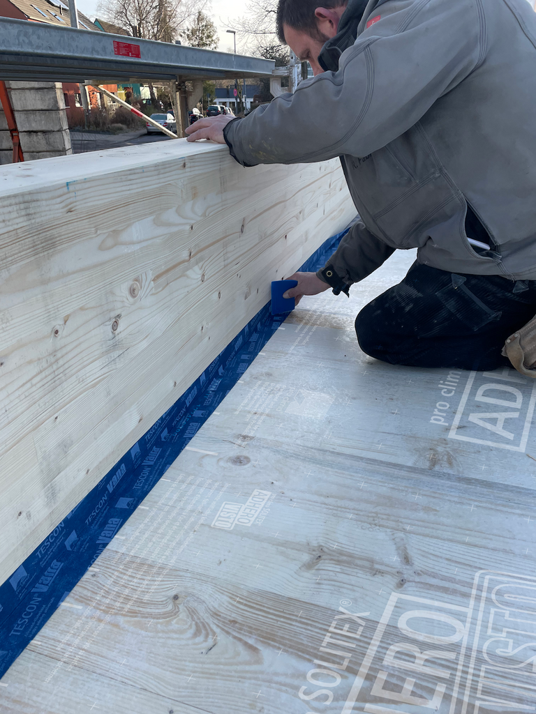 Pro Clima Solitex Adhero Visto självklistrande, transparant membran för lufttätning och väderskydd. 30 m x 1,5 m, 45 m². Tillfälligt skydd för golv under konstruktion samt som tillfälligt skydd för mellangolv på flervåningshus i KL-trä eller trästomme under byggtiden.