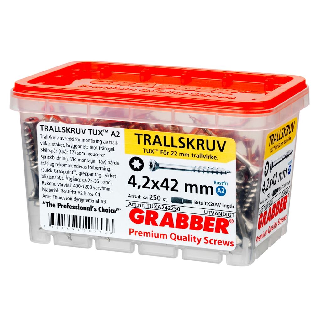 Trallskruv avsedd för montering utomhus av trallvirke, staket, bryggor etc. mot träregel. TX20 grepp. Vid montage i (av) hårda träslag rekommenderas förborrning. Rekommenderat varvtal: 400-1200 varv/min. Åtgång ca 25-35 st/m2.
