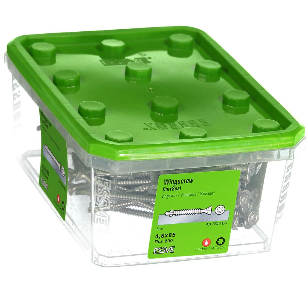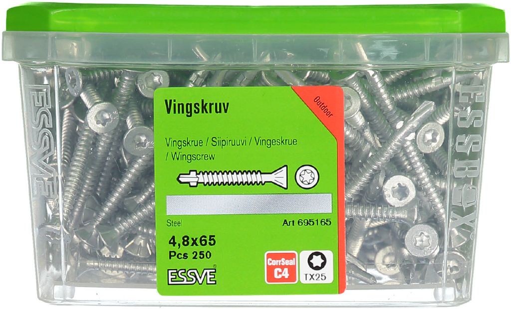 ESSVE Vingskruv är ämnad för montering av trä- och skivmaterial mot stål inomhus och utomhus. Ytterdiameter: 4,8 mm, Diameter Huvud: 9,5, Längd x mm. 200-250 skruvar.